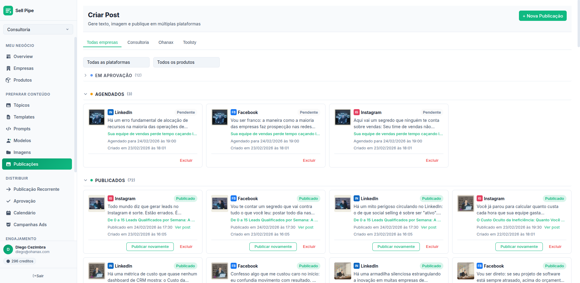 Tela real do SellPipe — crie, publique e acompanhe tudo em um só lugar